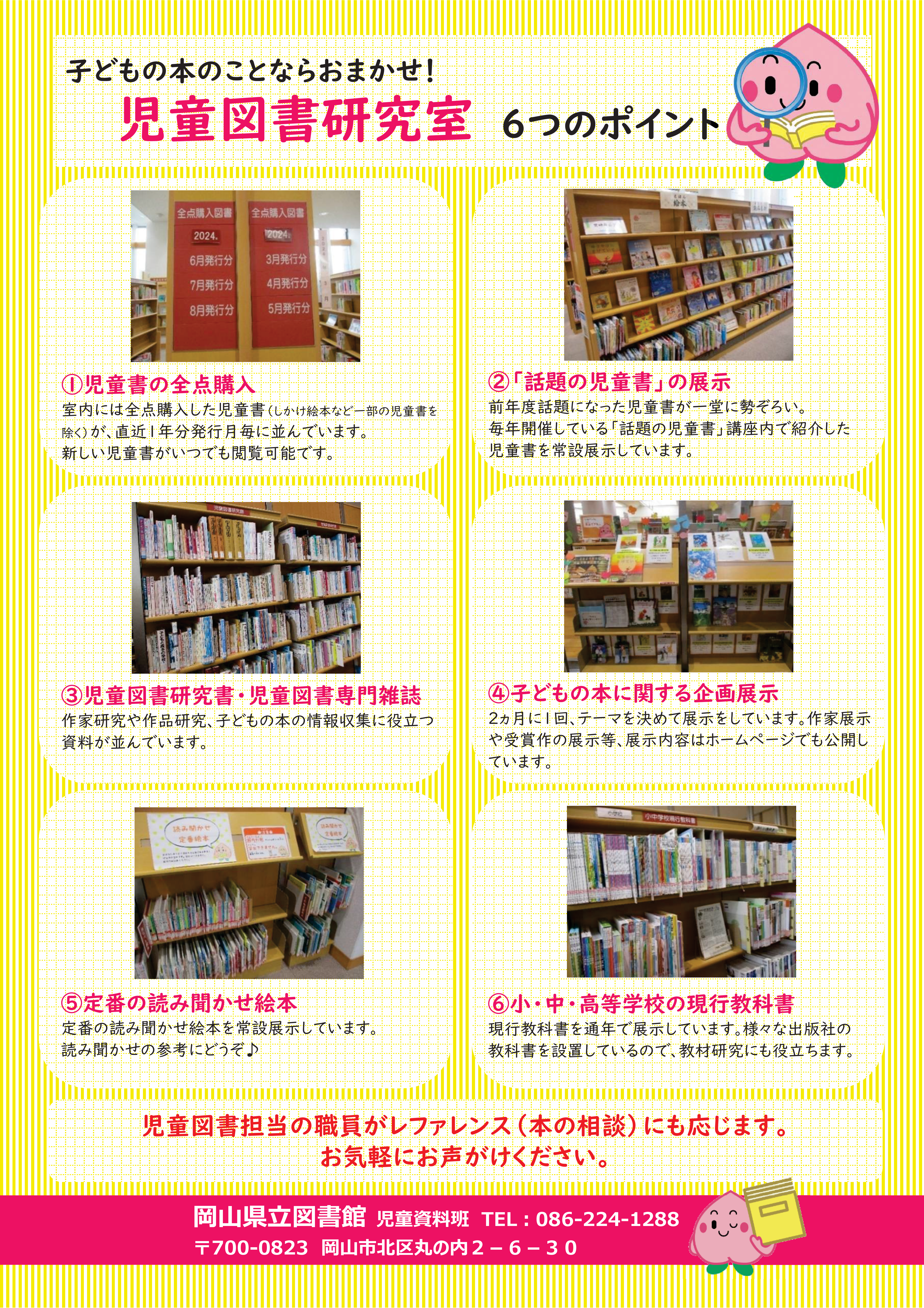 | ①新刊の全点購入児童図書 (個人貸出はできません) ※遠方にお住まいで岡山県立図書館へ来館できない方は市町立図書館で閲覧する方法もあります。ご相談下さい。 (ただし岡山県内に限ります) |